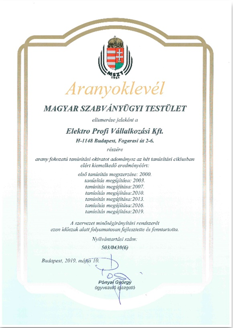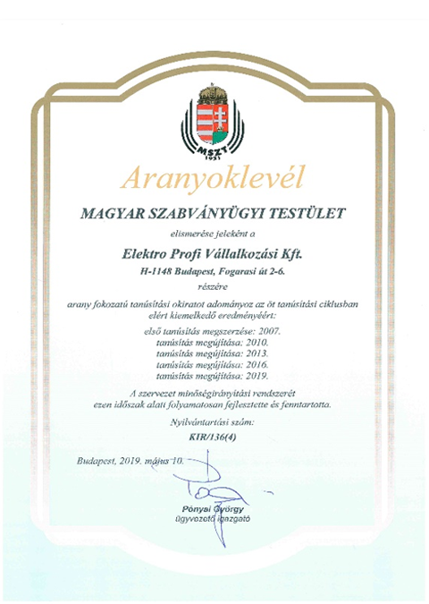 A Magyar Szabványügyi Testület az ELEKTRO PROFI Vállalkozási Kft.-nek aranyoklevelet adományozott minőség- és környezetközpontú irányítási rendszerével kapcsolatos elkötelezettségének elismeréseként. Aranyoklevelet azok a szervezetek kaphatnak, amelyek irányítási rendszerüket kiválóan, eredményesen működtetik és fejlesztik, valamint tanúsítványukat 12 éven keresztül tartják fenn a Magyar Szabványügyi Testületnél.