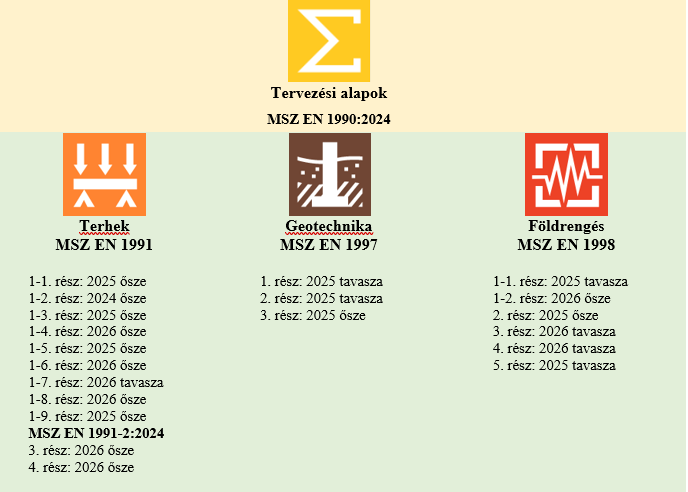 A most megjelent 20 szabvány (12 db MSZ EN és 8 db MSZ CEN/TS) az első komolyabb csomag, amelyet fokozatosan követnek az új szabványok, ütemezett megjelenéssel évente két alkalommal (tavasszal és ősszel). Az első generációs Eurocode-szabványok 2028 áprilisában kerülnek visszavonásra, így mindegyik most megjelent szabvány tartalmaz egy bizottsági állásfoglalást a két generáció együttélésére vonatkozóan.