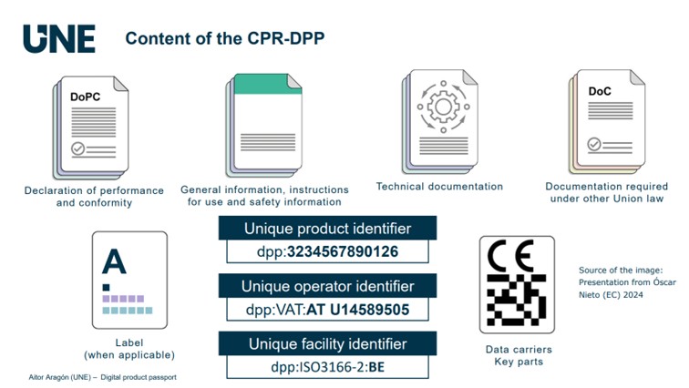 A Spanyol Szabványügyi Testület (UNE) részéről Aitor Aragón Basabe arról tartott előadást, hogy hogyan kell majd egy adott építési termék egyre több kötelezően megadandó paraméterét (beleértve a környezeti fenntarthatósági teljesítményét is) a 2024/3110/EU szerint digitálisan is megadni. Míg a 305/2011/EU szerinti teljesítménynyilatkozatban (DoP) csak a termék teljesítményéhez kapcsolódó, addig a 2024/3110/EU szerinti teljesítmény- és megfelelőségi nyilatkozatban (DoPC) már ezeken túl a termék környezeti fenntarthatósági teljesítményét is meg kell adni. Ez a megnövekedett adatmennyiség már nehezen kezelhető hagyományos módon, így a cél a géppel olvasható formátumú nyilatkozatok kiadása, amelyre a 2024/3110/EU a digitális termékútlevél (DPP) formájában kötelezettséget is ró a gazdasági szereplőkre (gyártókra vagy forgalomba hozókra).