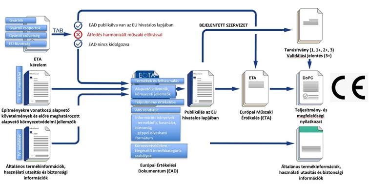 Hasonlóan a harmonizált szabványokhoz az EOTA-út eredménye is egy DoPC és a kapcsolódó CE-jelölés, azonban nem vonatkoznak rá a 2024/3110/EU III. melléklete szerinti termékkövetelmények, így az azoknak való megfelelőségről nem kell nyilatkozni. Azonban ugyanúgy vonatkoznak rá a CE-jelölés tartalmára, a környezeti jellemzők megadására, valamint a digitális elérhetőségre és az AVS-rendszerekre vonatkozó előírások.