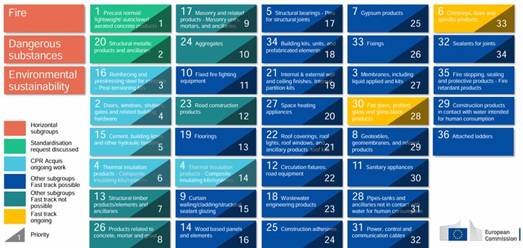 Az alcsoportok munkája 4 mérföldkő szerint zajlik (I. a termék azonosítása; II. a műszaki bizottságok megalakítása; III. a műszaki tartalom előkészítése; IV. az eredmények végső konzultációja). Ennek eredményeként kiadott szabványosítási kérelem egy sokkal alaposabb és nagyobb terjedelmű dokumentum, mint a 305/2011/EU szerinti korábbi mandátumok. Tulajdonképpen minden lényeges paramétert meghatároznak ebben a fázisban, így a szabványügyi testületek mozgástere eléggé szűkös, amit erősít az is, hogy a szabványokat egy megadott határidőig ki kell dolgozni. E szigorú szabályokkal tervezi elérni az Európai Bizottság, hogy ne alakulhassanak ki olyan anomáliák, mint amilyenek 2018 óta érzékelhetők a területen.