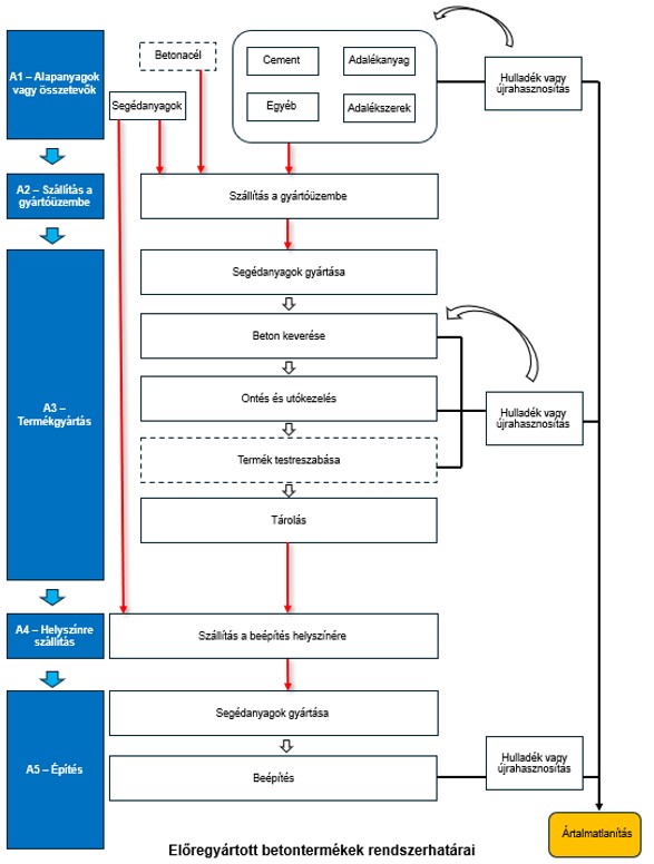 A környezeti hatások meghatározásához rengeteg információ és rengeteg háttéranyag szükséges. Fontos azonban, hogy a 2024/3110/EU szerinti alapvető környezeti jellemzők fokozatosan válnak kötelezővé. Az MSZ EN 15804 megadja a szükséges rendszerhatárokat, de az adott termékcsaládra vonatkozóan szükségesek még kiegészítő szabályok is (pl. beton esetén az MSZ EN 16757:2023). Nehezítő tényező, hogy míg az életciklus-információk közül a termék- és az építési szakaszra (A1–A5) nagy rálátása lehet a gyártónak, addig a későbbi életszakaszok (B: használati szakasz, C: életút vége szakasz), valamint a D modul (előnyök és terhelések a rendszerhatáron kívül) esetén csak feltételezésekkel élhet.