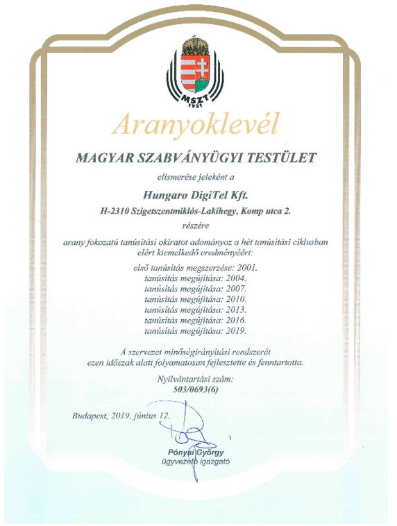 Az auditorok javaslata alapján az MSZT pozitív döntést hozott a tanúsítási/okirat-megújító audit kapcsán a nemzeti MSZT-, és a nemzetközi IQNet-tanúsítványok kiadására vonatkozólag, valamint a minőségirányítási rendszerrel kapcsolatos elkötelezettség elismeréseként aranyoklevelet adományozott. Aranyoklevelet azok a szervezetek kaphatnak, amelyek irányítási rendszerüket kiválóan és eredményesen működtetik, fejlesztik, valamint tanúsítványukat 12 éven keresztül tartják fenn a Magyar Szabványügyi Testületnél.