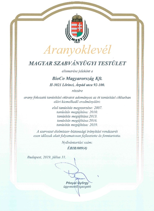 A Magyar Szabványügyi Testület aranyoklevelet adományozott a BioCo Magyarország Kft.-nek élelmiszer-biztonsági irányítási rendszerével kapcsolatos elkötelezettségének elismeréseként. Aranyoklevelet azok a szervezetek kaphatnak, amelyek irányítási rendszerüket eredményesen működtetik és fejlesztik, valamint tanúsítványukat 12 éven keresztül tartják fenn a Magyar Szabványügyi Testületnél.