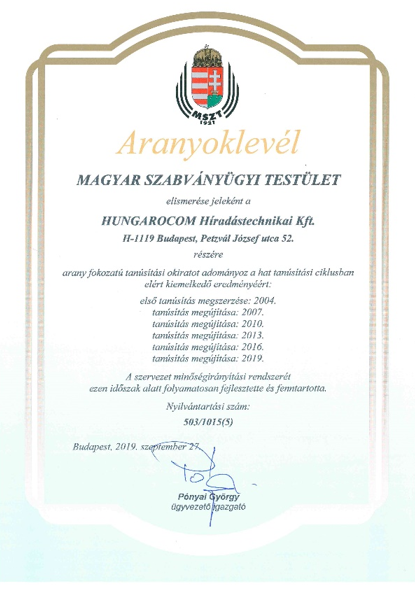 A Magyar Szabványügyi Testület ügyvezető igazgatója aranyoklevelet adományozott a HUNGAROCOM Híradástechnikai Kft.-nek minőségirányítási rendszerével kapcsolatos elkötelezettségének elismeréseként. Aranyoklevelet azok a szervezetek kaphatnak, amelyek irányítási rendszerüket eredményesen működtetik és fejlesztik, valamint tanúsítványukat 12 éven keresztül tartják fenn a Magyar Szabványügyi Testületnél.