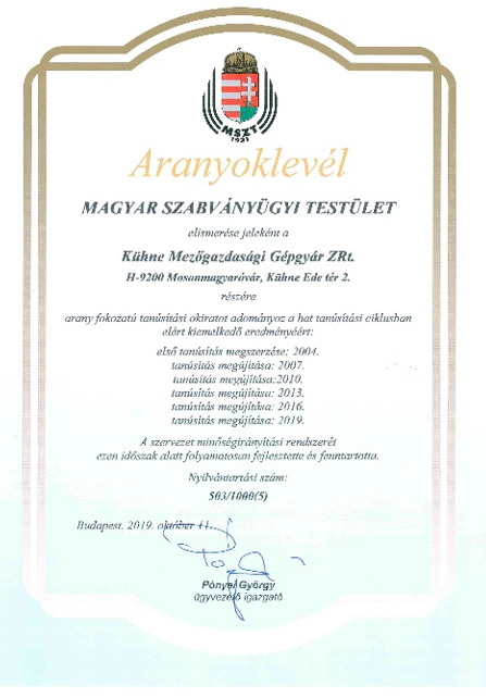 A Magyar Szabványügyi Testület ügyvezető igazgatója aranyoklevelet adományozott a Kühne Mezőgazdasági Gépgyár Zrt. részére minőségirányítási rendszerével kapcsolatos elkötelezettségének elismeréseként. A kitüntetést azok a cégek kaphatják, amelyek irányítási rendszerüket kiválóan és eredményesen működtetik, fejlesztik és a tanúsítványukat 12 éven keresztül fenntartják a Magyar Szabványügyi Testületnél.