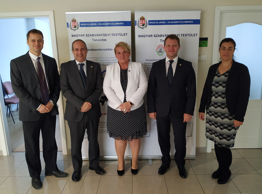 A képen balról jobbra haladva Krantz Domokos főosztályvezető-helyettes (MSZT Szabványosítási Titkárság), mellette Pedro Alves, az IQNet ügyvezető igazgatója és auditora, középen Kéki Zsuzsanna főosztályvezető (MSZT Tanúsítási Titkárság), mellette Andrey Vinogradov auditcsoport-vezető és Szamosiné Dávid Izabella mb. főosztályvezető-helyettes (MSZT Tanúsítási Titkárság)