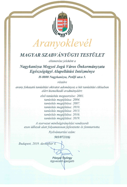 A Magyar Szabványügyi Testület aranyoklevelet adományozott Nagykanizsa Megyei Jogú Város Önkormányzata Egészségügyi Alapellátási Intézményének minőségirányítási rendszerével kapcsolatos elkötelezettségének elismeréseként. Aranyoklevelet azok a szervezetek kaphatnak, amelyek irányítási rendszerüket eredményesen működtetik és fejlesztik, valamint tanúsítványukat legalább 12 éven keresztül tartják fenn a Magyar Szabványügyi Testületnél.