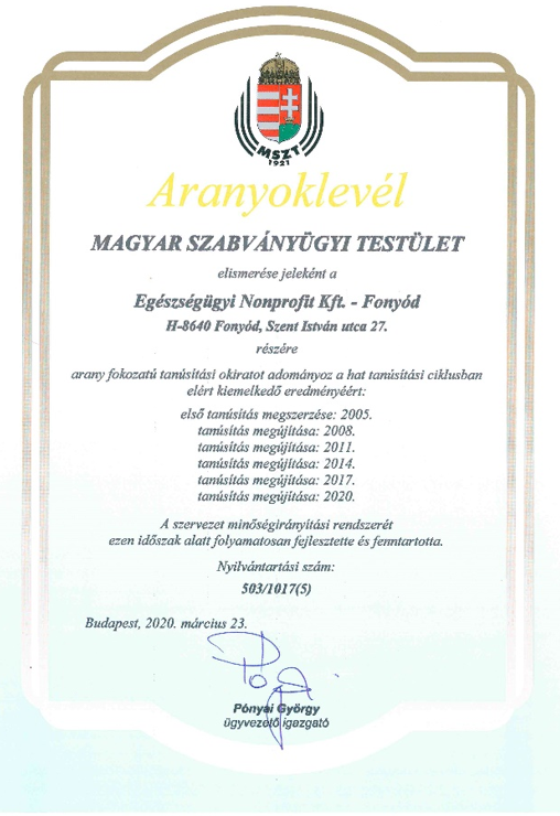 A sikeres megújító audit eredményeként kiadott nemzeti MSZT- és nemzetközi IQNet-tanúsítvány mellett az MSZT ügyvezető igazgatója aranyoklevéllel ismerte el az Egészségügyi Nonprofit Kft. – Fonyód minőségirányítási rendszerének működtetése iránti elkötelezettségét. A kitüntetést azok a szervezetek kaphatják, amelyek irányítási rendszerüket eredményesen működtetik és fejlesztik, valamint tanúsítványukat legalább 12 éven keresztül tartják fenn a Magyar Szabványügyi Testületnél.