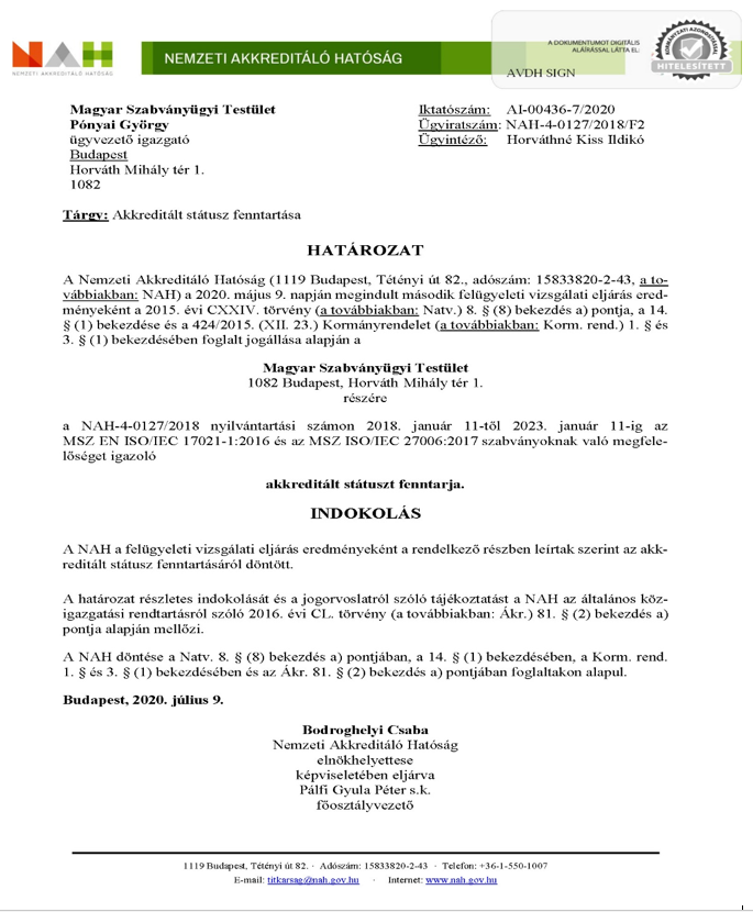 2020 júniusában tartotta a Nemzeti Akkreditáló Hatóság (NAH) az irodai helyszíni szemlét a Magyar Szabványügyi Testületnél (MSZT), az információbiztonsági irányítási rendszerek tanúsítása területén. Az MSZT telephelyén lefolytatott vizsgálatot egy tanúsított szervezet távauditálási technikával folytatott helyszíni auditjának megfigyelése egészítette ki, pozitív eredménnyel. A NAH 2020. július 9-én döntött az akkreditált státusz fenntartásáról.