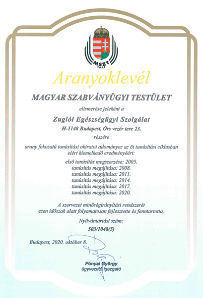 A Zuglói Egészségügyi Szolgálat (ZESZ) részére az intézmény minőségirányítással kapcsolatos elkötelezettsége elismeréseként a Magyar Szabványügyi Testület 2020. október 8-ai dátummal aranyoklevelet adományozott.