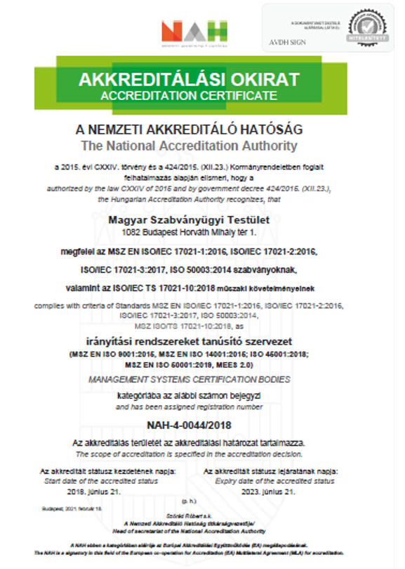 A Nemzeti Akkreditáló Hatóság (NAH) 2021 februárjában két napon át tartotta felügyeleti eljárásának irodai helyszíni szemléjét a Magyar Szabványügyi Testületnél (MSZT) az irányítási rendszerek (MIR, KIR, MEBIR, EgIR, MEES 2.0) tanúsítása területén integrált eljárásban, kiemelt figyelmet fordítva MEES 2.0 követelményeivel kapcsolatos áttérési követelményeknek való megfelelőségre. Az MSZT telephelyén lefolytatott vizsgálatot az auditorok helyszíni megfigyelése egészítette ki, pozitív eredménnyel. Köszönjük azoknak az ügyfeleinknek és auditorainknak, akik segítő támogatásukkal biztosították a zökkenőmentes és sikeres eljárás lebonyolítását. A NAH 2021. február 18-án döntött a módosított akkreditálási okirat kiadásáról, mely döntéstől kezdve az MSZT jogosult MEES 2.0 szerinti akkreditált tanúsítvány kiadására.