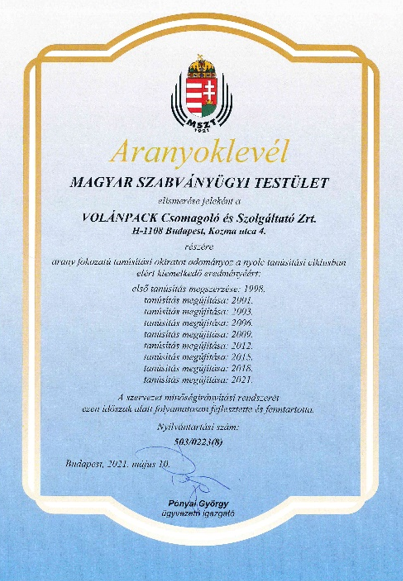 A Magyar Szabványügyi Testület ügyvezető igazgatója aranyoklevelet adományozott a VOLÁNPACK Csomagoló és Szolgáltató Zrt.-nek minőségirányítási rendszerével kapcsolatos elkötelezettségének elismeréseként. Aranyoklevelet azok a szervezetek kaphatnak, amelyek irányítási rendszerüket eredményesen működtetik és fejlesztik, valamint tanúsítványukat legalább 12 éven keresztül tartják fenn a Magyar Szabványügyi Testületnél.