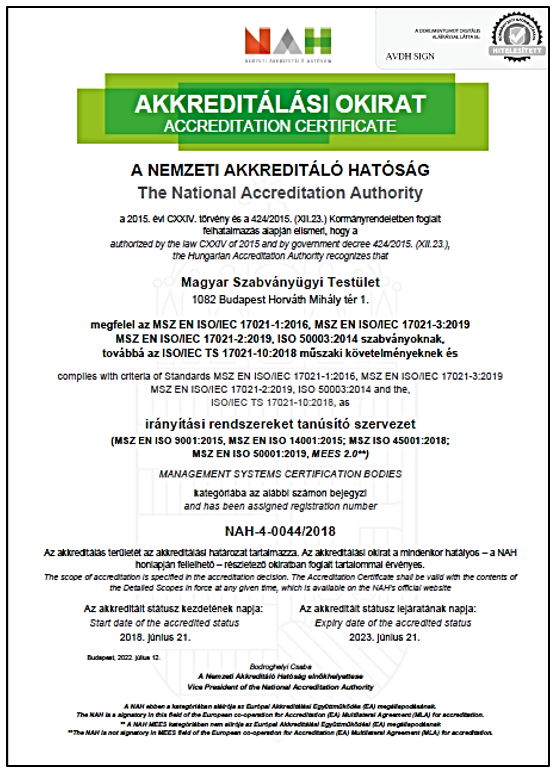 2022. május 10-én, 12-én és 19-én tartotta a Nemzeti Akkreditáló Hatóság (NAH) az irodai helyszíni szemléit a Magyar Szabványügyi Testületnél, az MSZ EN ISO 9001, MSZ EN ISO 14001, MSZ ISO 45001 és MSZ EN ISO 50001 szabványok, valamint a Magyar Egészségügyi Ellátási Standardok szerinti rendszerek tanúsítása területén. Az MSZT telephelyén lefolytatott vizsgálatot öt tanúsított szervezet helyszíni auditjának megfigyelése egészítette ki, pozitív eredménnyel. A NAH 2022. július 12-én döntött az akkreditált státusz fenntartásáról.