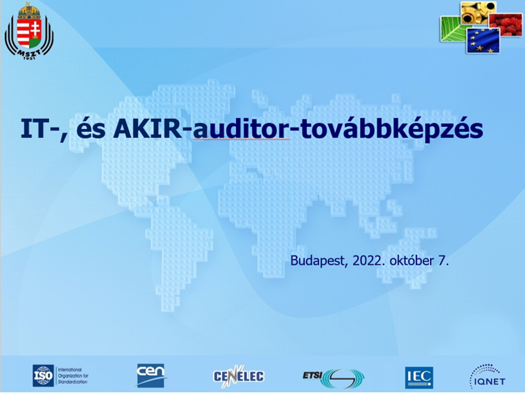 2022. október 7-én került sor az informatikai (ISO/IEC 27001, ISO/IEC 20000-1, ISO 22301, ISO/IEC 19770) és az antikorrupciós (ISO 37001) irányítási rendszerek auditorainak online továbbképzésére a Magyar Szabványügyi Testület Tanúsítási Titkársága szervezésében. Az auditortalálkozó célja a vonatkozó szabványok előírásainak ismertetésén túl az MSZT-auditorok egységes szemléletének erősítése, valamint az audittapasztalatok megbeszélése volt az alábbi program szerint: