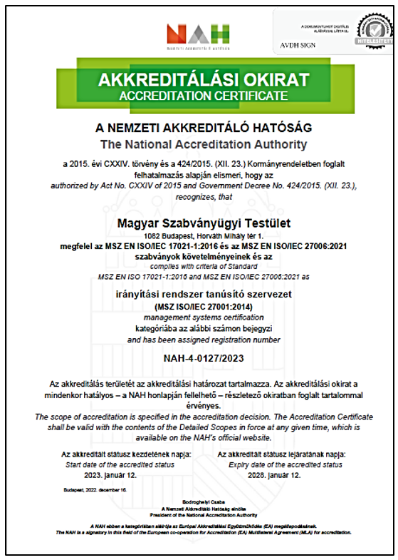 2022. október 13-án tartotta a Nemzeti Akkreditáló Hatóság (NAH) az újraakkreditáláshoz kapcsolódó irodai helyszíni szemlét a Magyar Szabványügyi Testületnél, az információbiztonság-irányítási rendszerek (IBIR) tanúsítása területén. Az MSZT telephelyén lefolytatott vizsgálatot egy tanúsított szervezet helyszíni auditjának megfigyelése egészítette ki, pozitív eredménnyel. A NAH 2022. december 16-án döntött az akkreditált státusz kiadásáról.