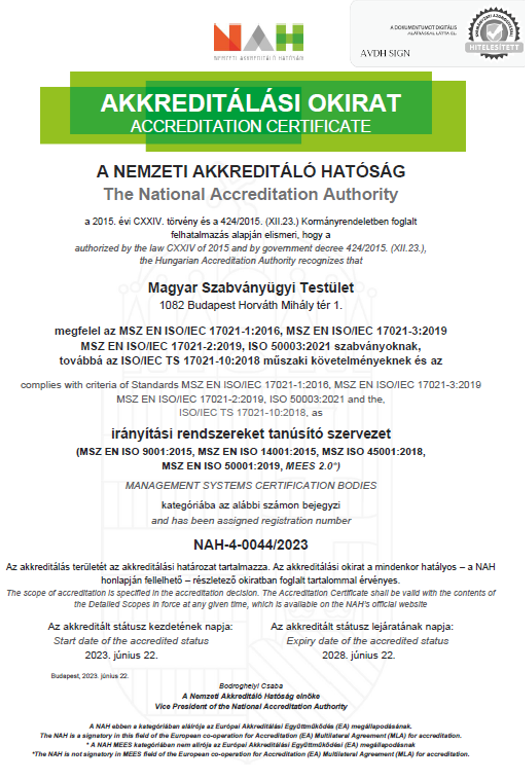2023. április 14-én, 19-20-án és 25-26-án tartotta a Nemzeti Akkreditáló Hatóság (NAH) az irodai helyszíni szemléit a Magyar Szabványügyi Testületnél, az MSZ EN ISO 9001, az MSZ EN ISO 14001, az MSZ ISO 45001, az MSZ EN ISO 50001 szabványok és a Magyar Egészségügyi Ellátási Standardok (MEES 2.0) szerinti rendszerek tanúsítása területén. Az MSZT telephelyén lefolytatott vizsgálatot hét tanúsított szervezet helyszíni auditjának megfigyelése egészítette ki, pozitív eredménnyel. Az akkreditáció az eddig fenntartott területek mellett tovább bővült az alábbi IAF-kódokkal: