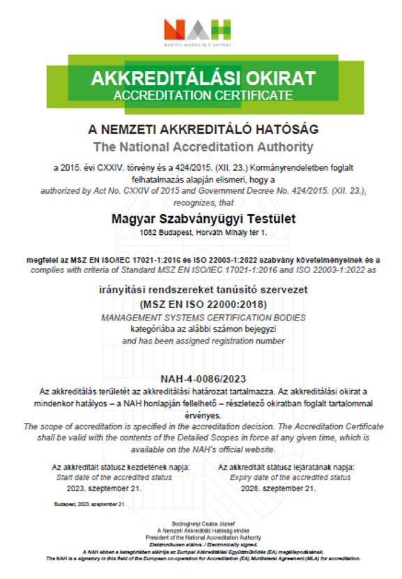 2023. augusztus 10-én tartotta a Nemzeti Akkreditáló Hatóság (NAH) az irodai helyszíni szemléjét a Magyar Szabványügyi Testületnél az MSZ EN ISO 22000 szabvány szerinti rendszer tanúsítása területén. Az MSZT telephelyén lefolytatott vizsgálatot egy tanúsított szervezet helyszíni auditjának megfigyelése egészítette ki, pozitív eredménnyel. Az akkreditáció az eddig fenntartott területek mellett tovább bővült a Kiegészítő szolgáltatások (H) élelmiszerlánckóddal, így már tíz kategóriában nyújtjuk szolgáltatásainkat partnereink részére. A NAH 2023. szeptember 21-én döntött az akkreditáció 5 évre való kiadásáról.