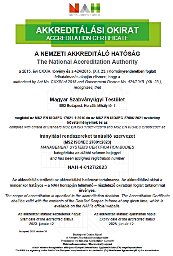 2023. szeptember 29-én tartotta a Nemzeti Akkreditáló Hatóság (NAH) a felügyeleti eljáráshoz kapcsolódó irodai helyszíni szemlét a Magyar Szabványügyi Testületnél, az információbiztonság-irányítási rendszerek (IBIR) tanúsítása területén. Az MSZT telephelyén lefolytatott vizsgálatot egy tanúsított szervezet helyszíni auditjának megfigyelése egészítette ki, pozitív eredménnyel. A NAH 2023. október 26-án döntött az akkreditált státusz kiadásáról az új követelmények teljesítése tekintetében.