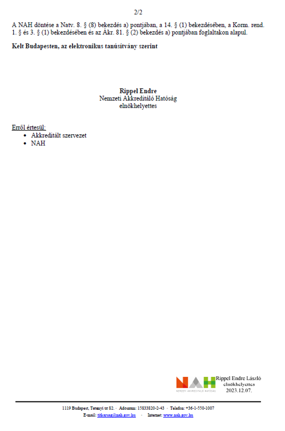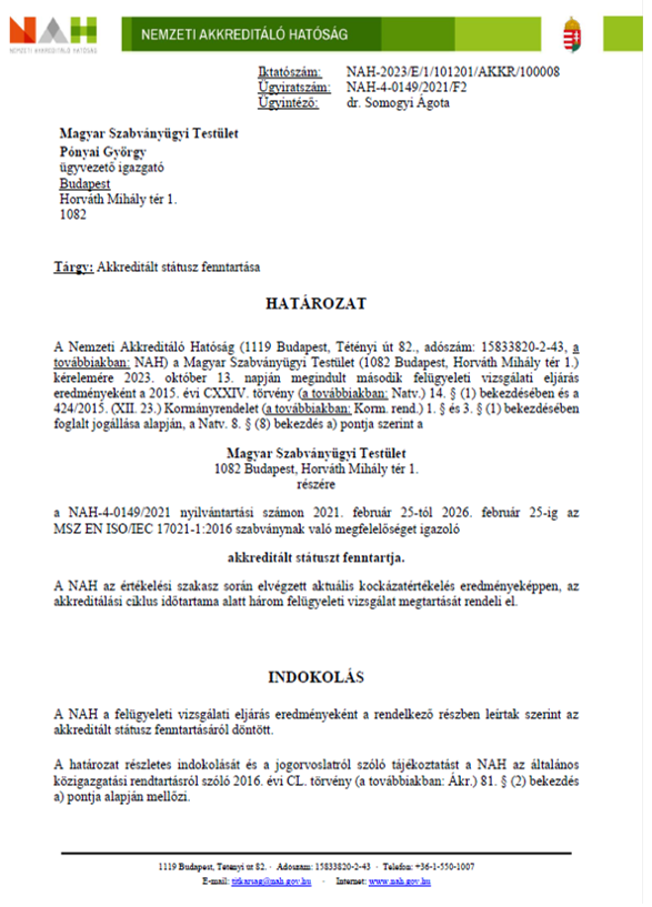 2023. november 23-án tartotta a Nemzeti Akkreditáló Hatóság (NAH) az irodai helyszíni szemlét a Magyar Szabványügyi Testületnél, a vasúti szervezetek üzleti irányítási rendszerek (VIR) tanúsítása területén. Az MSZT telephelyén végzett vizsgálatot egy tanúsított szervezet helyszíni auditjának megfigyelése egészítette ki, pozitív eredménnyel. A NAH 2023. december 7-én döntött a NAH-4-0149/2021 nyilvántartási számú akkreditált státusz fenntartásáról.