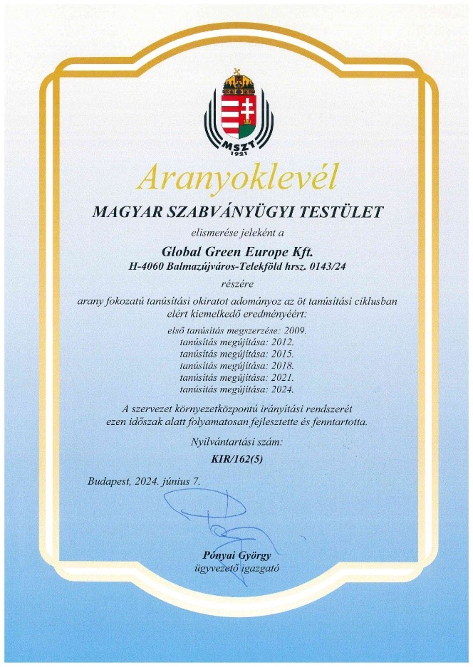 A Magyar Szabványügyi Testület aranyoklevelet adományozott a Global Green Europe Kft.-nek környezetközpontú irányítási rendszerével kapcsolatos elkötelezettségének elismeréseként. Aranyoklevelet azok a szervezetek kaphatnak, amelyek irányítási rendszerüket eredményesen működtetik és fejlesztik, valamint tanúsítványukat legalább 12 éven keresztül tartják fenn a Magyar Szabványügyi Testületnél.