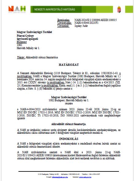 2024. április 17-én és május 2-án tartotta a Nemzeti Akkreditáló Hatóság (NAH) az irodai helyszíni szemléit a Magyar Szabványügyi Testületnél, az MSZ EN ISO 9001, az MSZ EN ISO 14001, az MSZ ISO 45001 és az MSZ EN ISO 50001 szabványok, valamint a Magyar Egészségügyi Ellátási Standardok (MEES 2.0) szerinti rendszerek tanúsítása területén. Az MSZT telephelyén lefolytatott vizsgálatot öt tanúsított szervezet helyszíni auditjának megfigyelése egészítette ki, pozitív eredménnyel. A NAH 2024. június 21-én döntött az akkreditált státusz fenntartásáról.