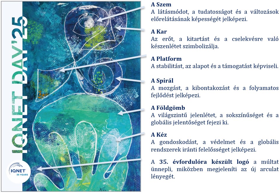 A 35. évfordulóra készült logó a múltat ünnepli, miközben megjeleníti az új arculat lényegét. A kék színvilág összhangban áll az IQNET-márka irányelveivel és az IQNet Ltd. akva árnyalatával van kombinálva.
