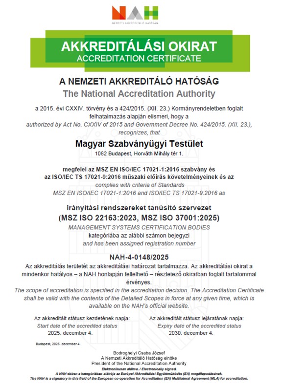2025. november 12-én és 19-én tartotta a Nemzeti Akkreditáló Hatóság (NAH) az irodai helyszíni szemléit a Magyar Szabványügyi Testületnél, az MSZ ISO 37001:2025 és az MSZ ISO 22163:2023 szabványok szerinti rendszerek tanúsítása területén. Az MSZT telephelyén lefolytatott vizsgálatot két tanúsított szervezet helyszíni auditjának megfigyelése egészítette ki, pozitív eredménnyel. Az MSZT elsők között nyújtotta be az MSZ ISO 37001:2025 szabványra vonatkozó NAH áttérési ütemtervében meghatározott feladatok teljesítésére vonatkozó kérelmét és az áttérés igazolásához szükséges dokumentumokat.